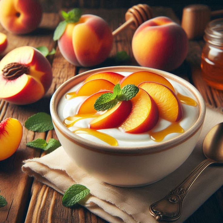 Smooth yogurt topped with juicy peach slices, golden honey, and refreshing mint.